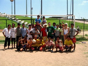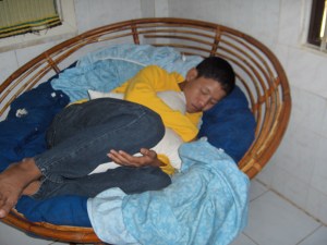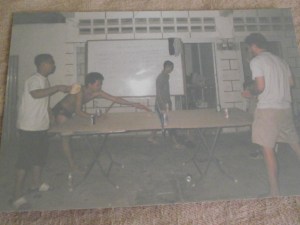 The boys joined a local footy team and played at the stadium every weekend. The multi-purpose kitchen table was moved out to the courtyard where many friendly but competitive games of pingpong were held. Note Saren, leaning across the table to hit the ball with, look closely, a meat cleaver borrowed from the cook.